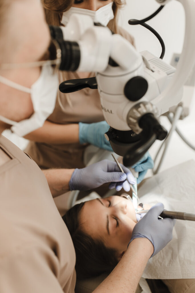 Rozpoczynamy od szczegółowego badania jamy ustnej w powiększeniu – przy użyciu lup lub mikroskopu, a w razie potrzeby wspomagamy się zdjęciem RTG, aby precyzyjnie ocenić stan zębów.